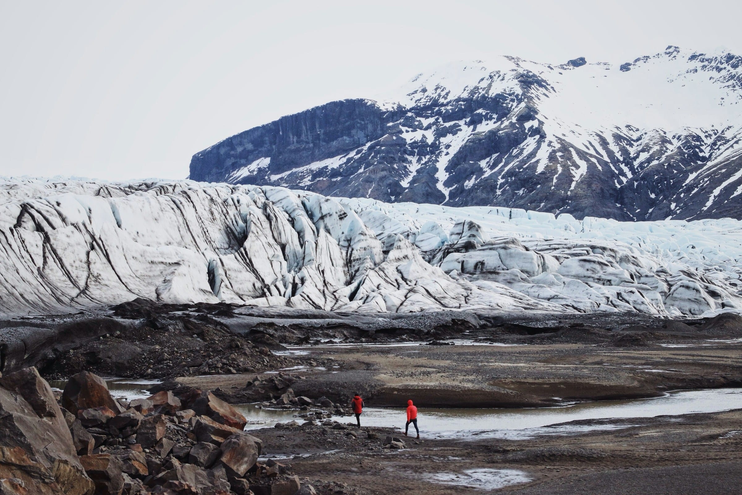 From the waterfall district, the route leads to Sólheimajökull, a glacier tongue descending from the vast Mýrdalsjökull ice cap. A short walk from the car park brings you to the glacier edge, where ancient ice meets dark moraine in a landscape of rare quiet and scale.